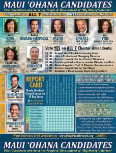 Hijacking pandemic angst, the Nevada-based Hui O Maui Citizens For Change is flooding local media with pro-old guard ads, describing candidates Alberta deJetley, Stacy Crivello, Claire Kamalu Carroll, Tom Cook, Rick Nava, and Tasha Kama, as “innovative community leaders who will help us build a better Maui.” The Super PAC also supports Alice Lee and Yuki Lei Sugimura.