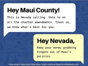 Banners urging Vote NO on all Maui County Charter Amendments are proliferating around Maui, while an off-island Super PAC is also disseminating more fear during this trying pandemic imploring support for the conservative old guard that has ruled Maui politics.